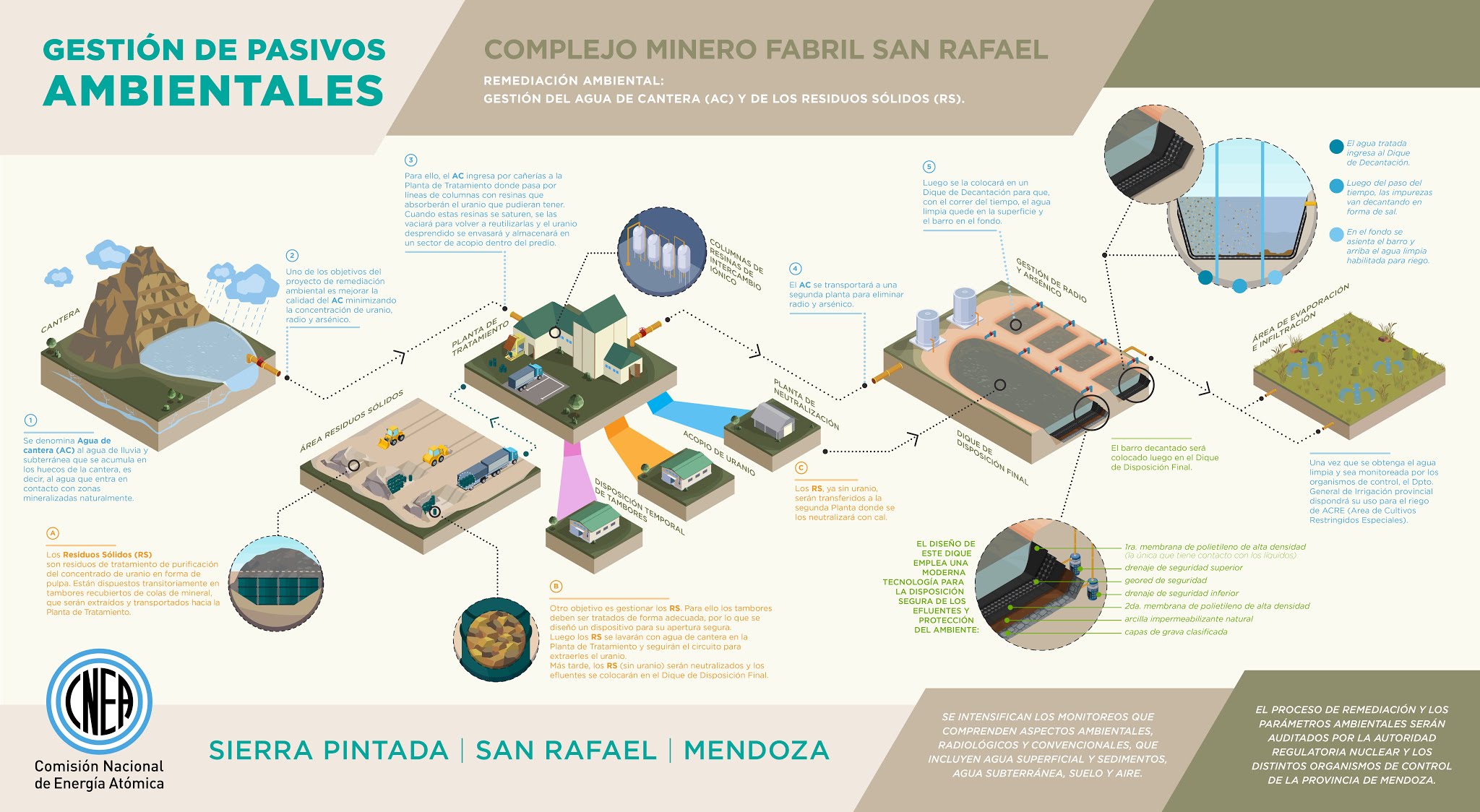 El primer día de octubre de 2019, la Comisión Nacional de Energía Atómica inició la tarea. Para esto, previamente había presentado una Manifestación General de Impacto Ambiental con un diagnóstico de la situación de la zona fundamentado en observaciones de campo y estudios y mediciones científicas. La propuesta del organismo nacional también incluyó, tal como ordenan las leyes de la provincia, un detalle de las acciones previstas para la remediación y el correspondiente cronograma.