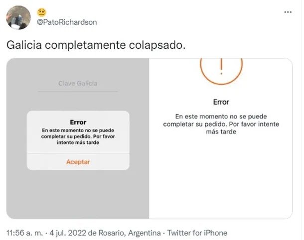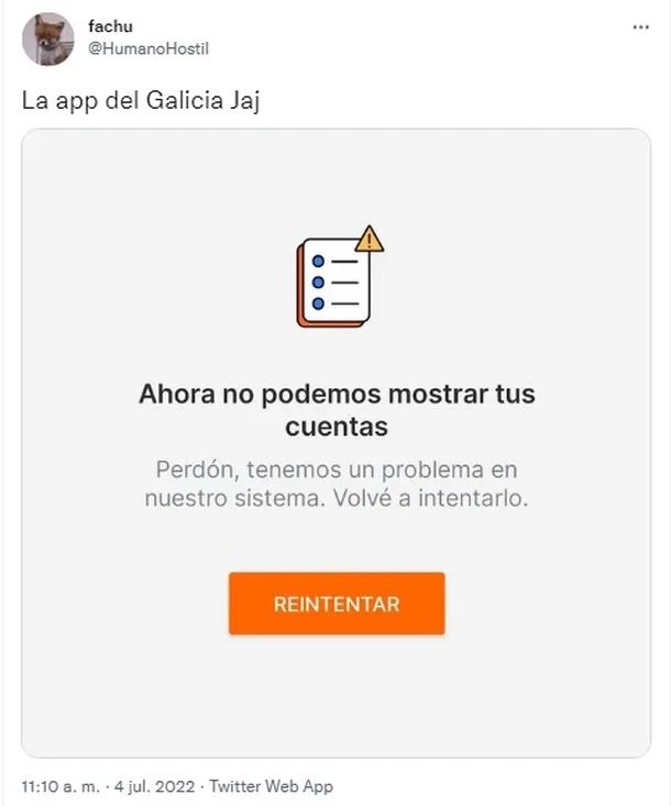 Usuarios reportaron este lunes cerca del mediodía fallas para ingresar a los sistemas de home banking de diferentes bancos en Argentina. A través de las redes sociales, varios expresaron su malestar con respecto al funcionamiento de las plataformas, tanto vía web o vía app, registrándose las mayores quejas sobre el Banco Galicia, Banco Santander y Banco Francés.