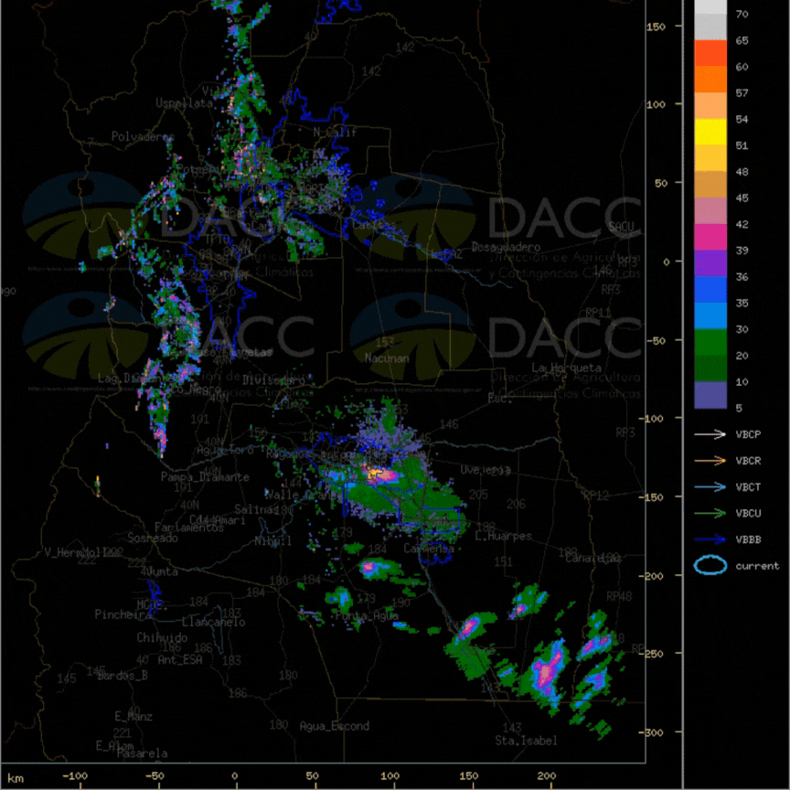 20:43 hs: Granizo sobre La Draga, Goudge, Las Aguaditas. Alerta para C. Colomer y La Llave Sur. Nueva celda con granizo en formación sobre Los Claveles y C. Seca. Sin problemas para el dpto. de G. Alvear.