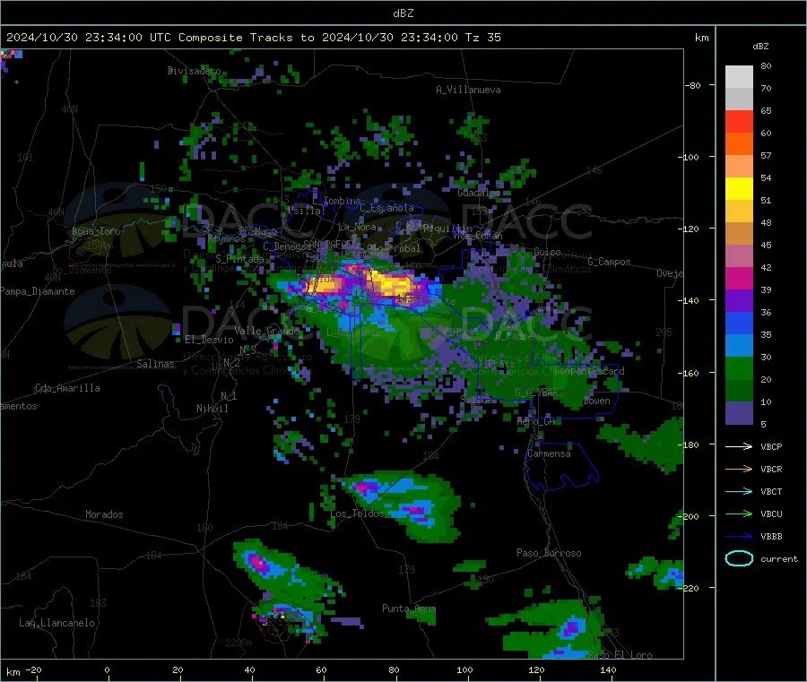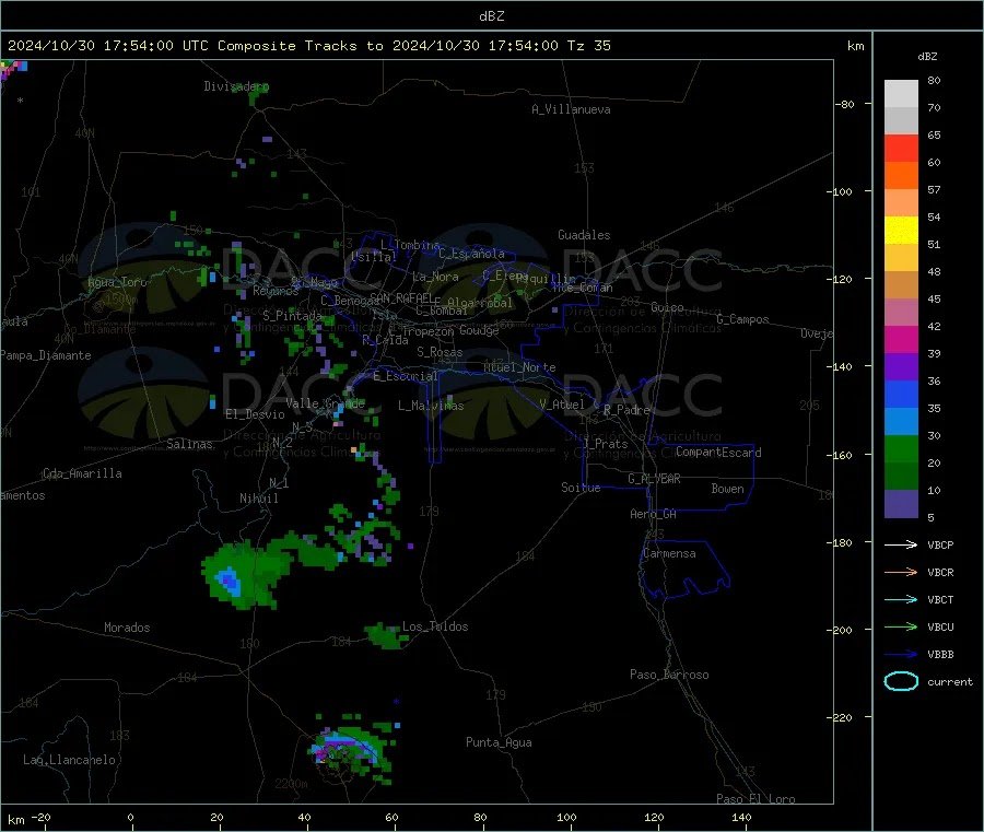 20:14 hs: ALERTA granizo para El Escorial, N de Malvinas,, RN 143, Salto de las Rosas y Calle Larga, en 8′. Lluvia para la ciudad de General Alvear.