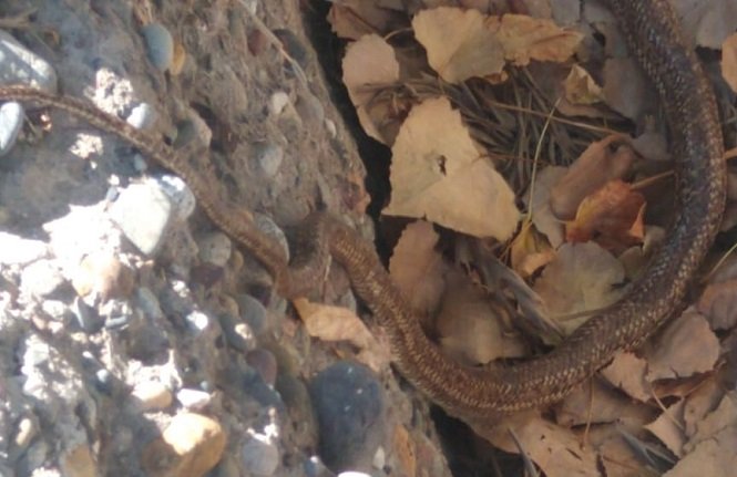 Sin embargo, la víbora aparentemente no parecía está dispuesta a abandonar su refugio y se escondió en la acequia llena de hojas. En la foto tomada por un vecino, se puede ver solamente la cola del reptil, que había logrado enterrarse entre las hojas y parecía estar a salvo de los curiosos.