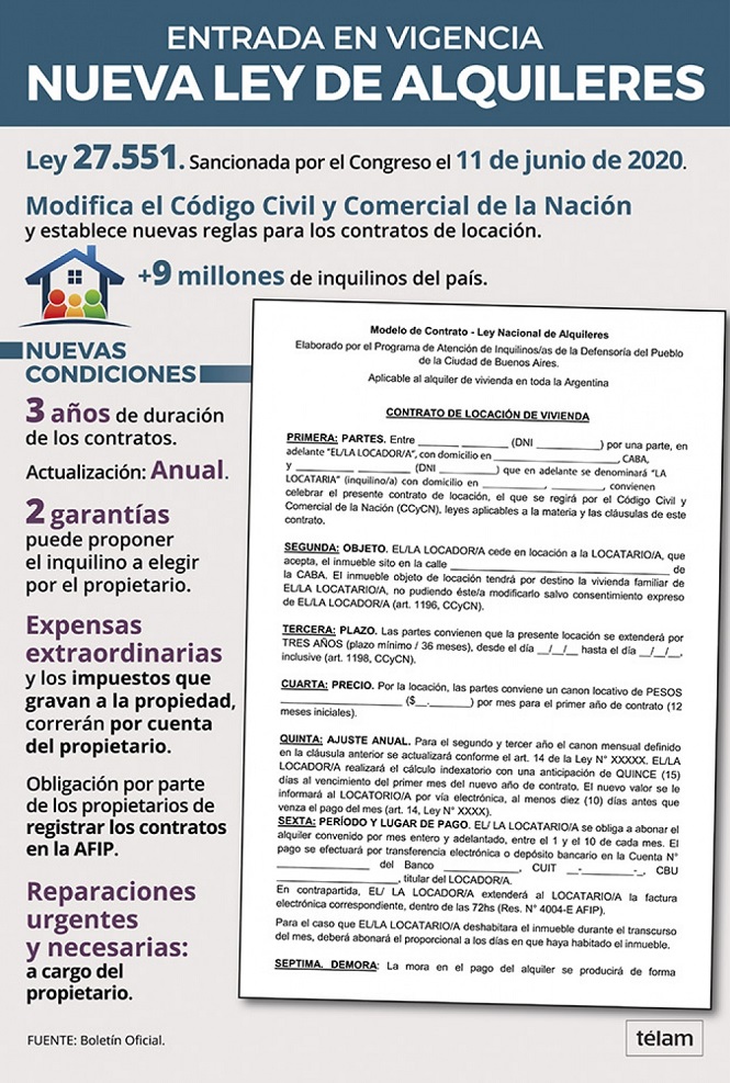 Los contratos de alquiler que se firmen a partir de hoy deberán contemplar nuevas condiciones como la extensión de tres años y la actualización anual sobre la base de un índice oficial, en base a las previsiones contempladas en la flamante Ley de Alquileres publicada ayer en el Boletín Oficial.
