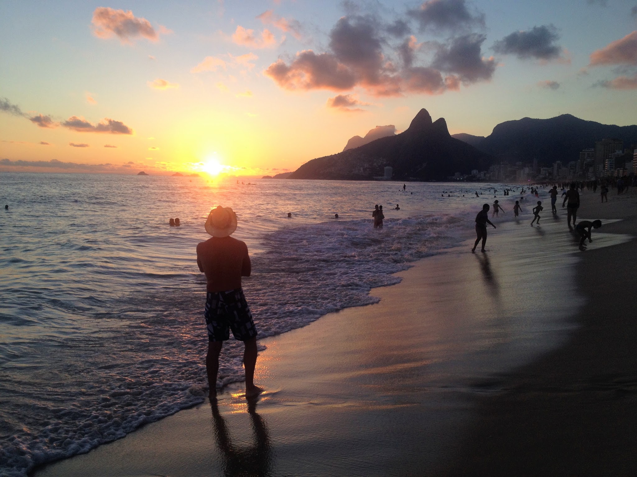 Puesta de sol en la playa Ipanema con el morro