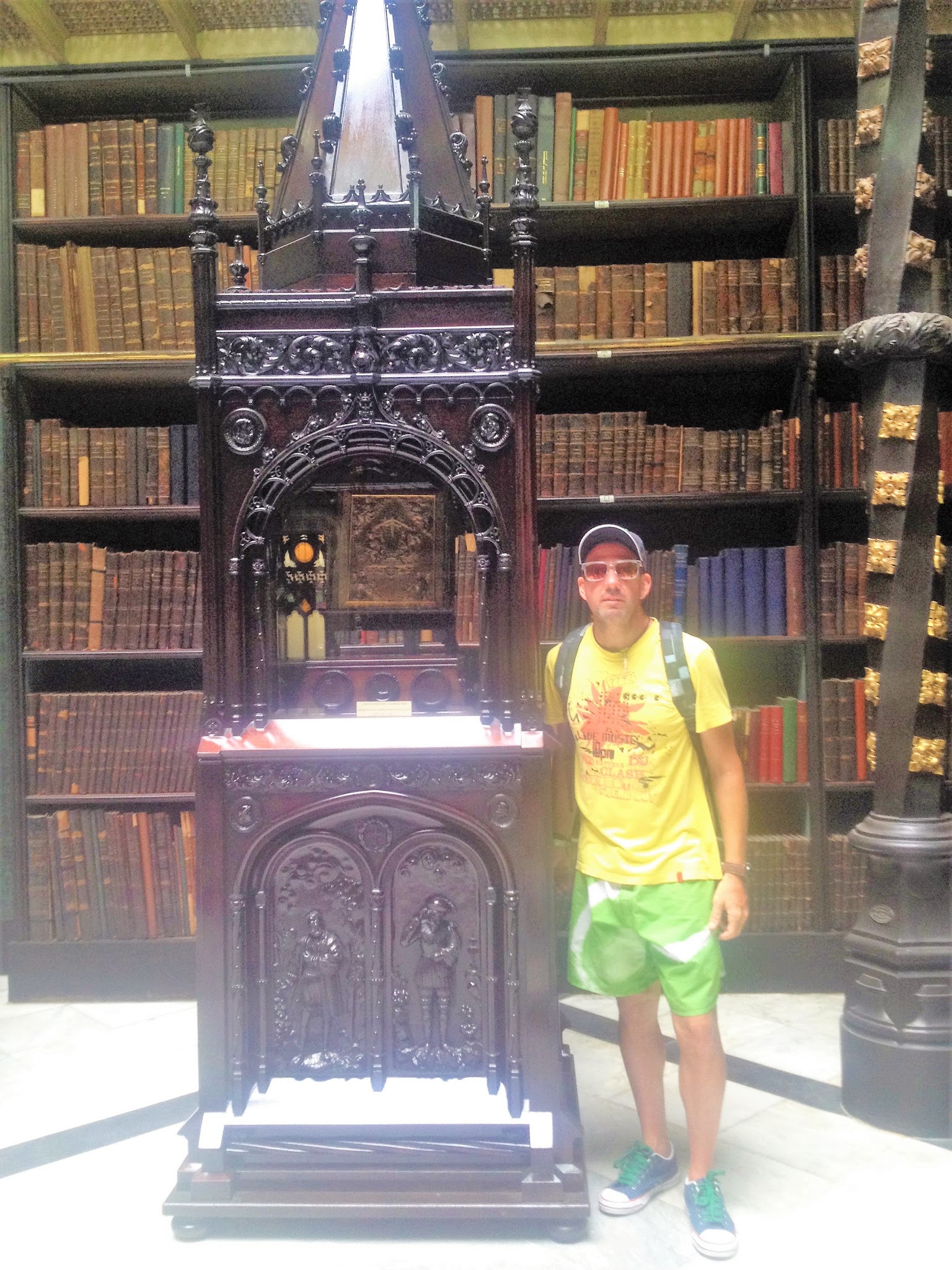Fuimos al recién inaugurado Museo del Mañana junto a la bahía de Ganabara. La cola era kilométrica y el tiempo de espera estimado de tres horas. Abandonamos la futurista estructura del edificio diseñado por Santiago Calatrava y cruzamos al Museo de Arte donde ingresamos en solo cinco minutos. Había visto en National Geographic las 10 bibliotecas más bellas del mundo y una de ellas era el Real Gabinete Portugués de Lectura ubicado en la calle Luis de Camoes en pleno centro. Una joya arquitectónica erigida durante el reinado de Manuel I (1495-1521) que combina elementos góticos con otros del Renacimiento italiano. El mobiliario, los vitreaux del techo, los libros y el ambiente donde flota el saber te deja sin habla. Si Río no me pareció la ciudad maravillosa de la que todos hablan este lugar sí que amerita ese calificativo.