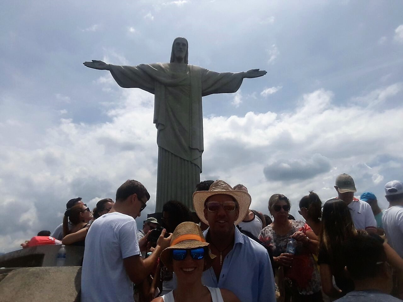 Hay colchonetas repartidas en el suelo para que la gente se recueste y hacer la toma de la escultura completa. Valeria llevaba un palo de selfie y de él nos servimos para lograr nuestras instantáneas sin tener que recostarnos en el suelo caliente. Todo Río se aprecia a los pies del cerro. Son vistas muy bellas pero no me quitaron el aliento. No se entiende muy bien como este lugar entró en las Siete Maravillas pero debe de haber sido que el pueblo brasileño (200 millones de habitantes, el quinto más poblado del mundo) votó masivamente a su Cristo y logró su cometido.
