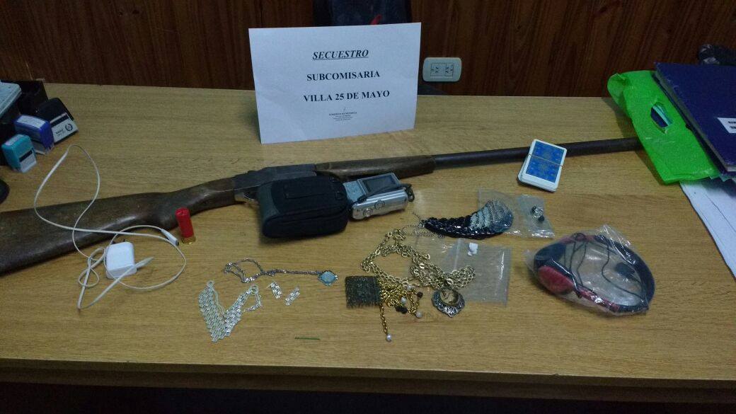 La víctima realizó una denuncia, donde dio cuenta que a las 10:00 hs. de este miércoles se retiró de su vivienda en la calle San Martín de la Villa 25 de Mayo y al regresar a la misma observó que habían dañado una puerta para ingresar y sustraerle una escopeta calibre 16, alhajas y una cámara fotográfica entre otros elementos.