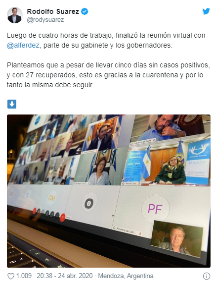 Rodolfo Suarez no canta victoria por los auspiciosos cinco días seguidos sin nuevos casos de contagios de coronavirus en Mendoza. Por eso apenas terminó la reunión virtual que duró cuatro horas con el presidente y los gobernadores apareció en Twitter con un mensaje fuerte.