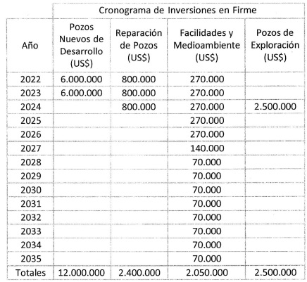 -la perforación de un (1) pozo exploratorio por dólares estadounidenses dos millones quinientos mil (USD 2.500.000) de conformidad con el cronograma de inversiones establecido.