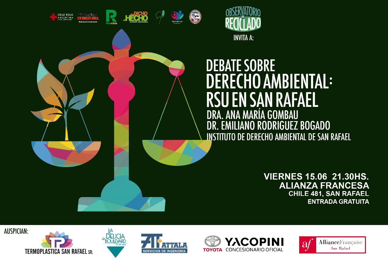 El Observatorio del Reciclado de San Rafael invita a la primera charla debate sobre Derecho Ambiental y Reciclado, que se realizará este viernes a partir de las 21:30 horas en la Alianza Francesa (Chile 481). Los oradores principales son reconocidos miembros del Instituto de Derecho Ambiental de nuestro departamento.