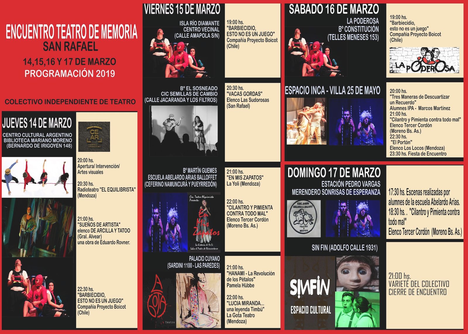 Los días 14, 15, 16 y 17 de Marzo se llevará a cabo en nuestra ciudad el 2° ENCUENTRO TEATRO DE MEMORIA, donde participarán elencos de Chile, Mendoza, Bs As., Gral. Alvear y San Rafael, brindando sus obras y talleres en distintos espacios de nuestro departamento.