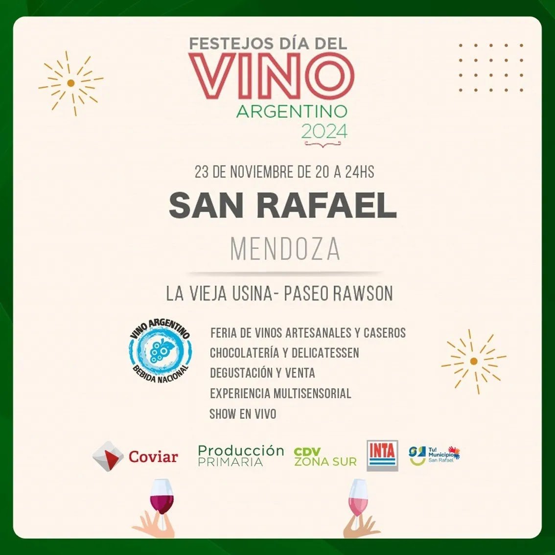 Cada 24 de noviembre, desde hace más de 10 años, se festeja el Día del Vino Argentino, bebida nacional y –en San Rafael- más de una decena de bodegas artesanales se reunirán para conmemorarlo en el Paseo Rawson.