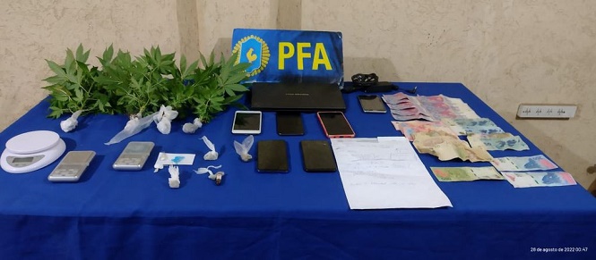 Los agentes federales detuvieron a tres personas e incautaron más de un kilo de cocaína, marihuana lista para la venta y plantines de cannabis sativa entre otros artículos como celulares y balanzas de precisión.