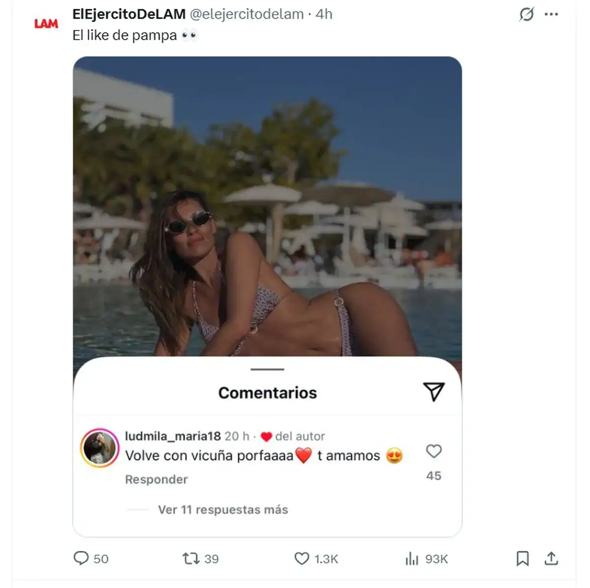 No obstante, lo que verdaderamente captó la atención fue el “me gusta” que la modelo le dio a un comentario de una usuaria que decía: “Volvé con Vicuña, porfa. Te amamos”.