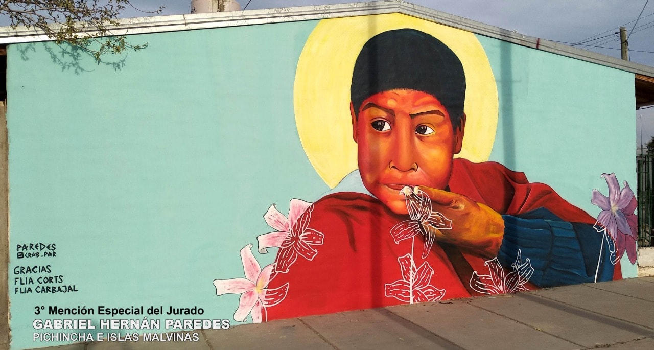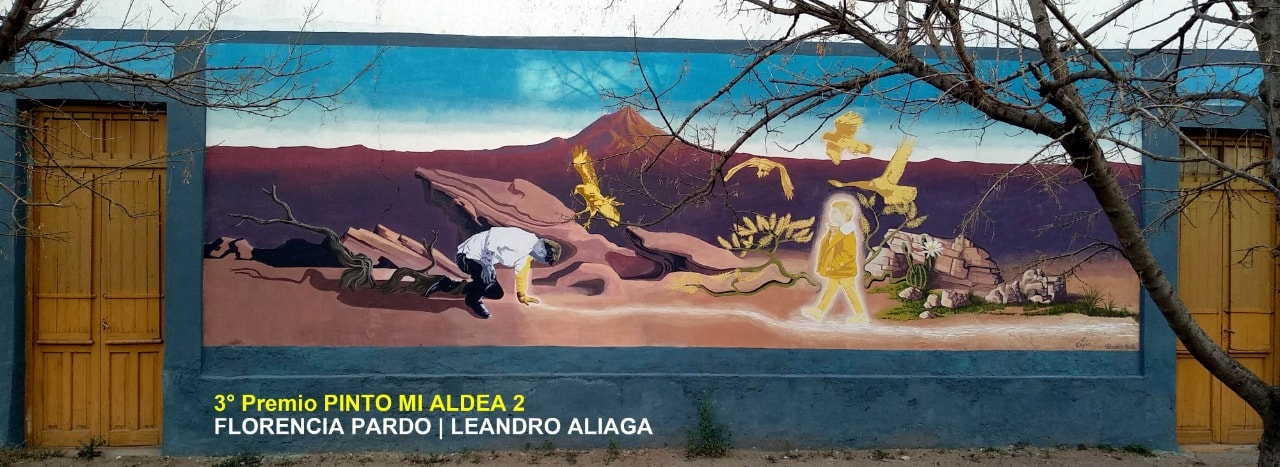 El 3er escalón del podio – ubicado en el cruce de Ombú y Mitre – es una creación de los muralistas Florencia Pardo y Leandro Aliaga. “El nuevo renacer del alma” es un paisaje montañoso y desértico, un hombre rodeado de cóndores, absorbe la energía de un personaje luminoso.