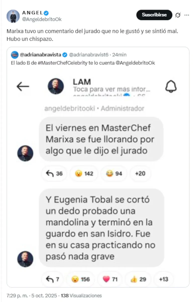 “El viernes en MasterChef Marixa (Balli) se fue llorando por algo que le dijo el jurado”, reveló Ángel de Brito en sus redes sociales durante el fin de semana, dejando entrever que la tensión se hizo sentir desde el arranque.
