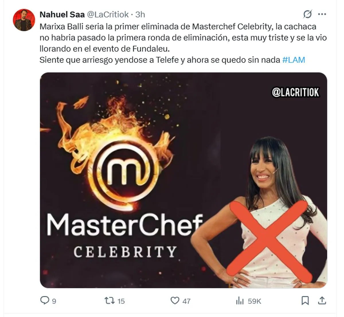 Según reveló el comunicador Nahuel Saa, conocido en redes como La Criti, ya habría una figura que no logró superar la primera instancia del certamen. A través de su cuenta de X, publicó: “Marixa Balli sería la primera eliminada de Masterchef Celebrity”.