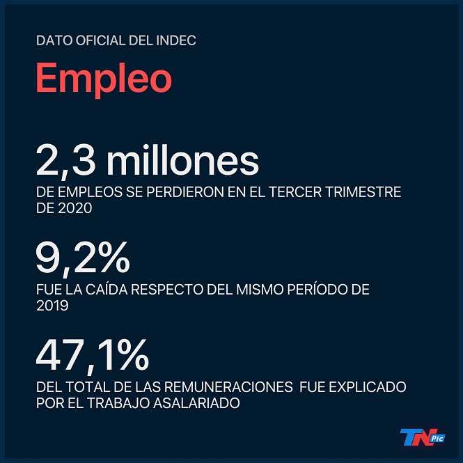 Según informó este miércoles el Instituto Nacional de Estadística y Censos (Indec), la caída del empleo alcanzó el 9,2% en el tercer trimestre de 2020, la mitad del desplome del 18% registrado en el trimestre anterior.