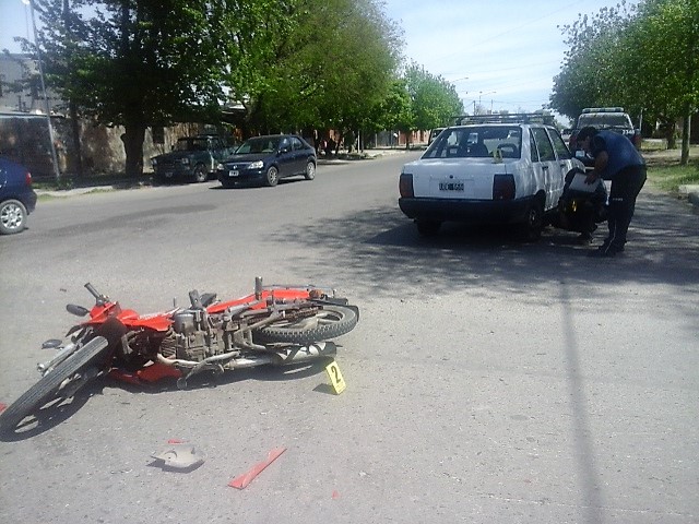 Un automóvil Fiat Duna circulaba por avenida Telles Meneses hacia el oeste, mientras que una motocicleta con dos ocupantes lo hacía por avenida San Martín al sur y al llegar a la intersección de ambas arterias por razones que se tratan de establecer colisionaron.