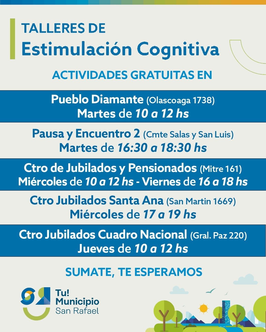 Los talleres se desarrollan los martes de 10 a 12 en Pueblo Diamante (Olascoaga 1738), los martes de 16.30 a 18.30 en Pausa y Encuentro II (Comandante Salas y San Luis), los miércoles de 9 a 11 y los viernes de 16 a 18 en la Asociación de Jubilados (Av. Mitre 161), los miércoles de 17 a 19 en el Centro de Jubilados Santa Ana (San Martín 1699), y los jueves de 10 a 12 en el centro de Jubilados de Cuadro Nacional (General Paz 220).