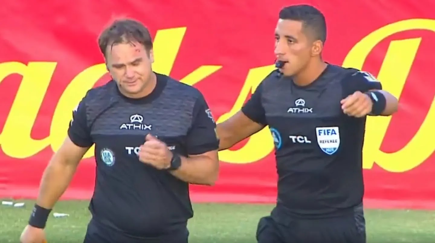 El asistente Diego Martín sufrió un fuerte golpe en su cabeza: le arrojaron un tubo que le cortó la frente. Además, inmediatamente se le hinchó la frente y el árbitro principal decidió terminar el encuentro a falta de 45 minutos.