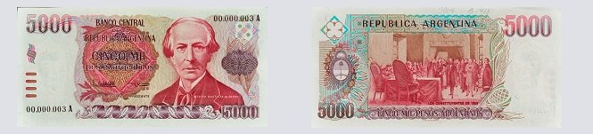 Argentina ya tuvo billetes de 5.000 pesos en el pasado. Por desagios y cambios de signo monetario ya hubo una emisión en la década de 1960, luego reapareció en 1977 con la imagen de José de San Martín anciano. Tras una quita de ceros llegó un billete de $5.000 con la imagen de Juan Bautista Alberdi en 1984. Y con con el cambio de moneda durante el gobierno de Raúl Alfonsín llegó en 1989 la emisión de 5.000 australes con el retrato de José Juárez Celman.