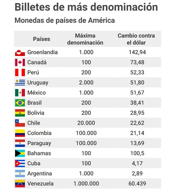 Por el impacto de la inflación, la Argentina se acerca a un triste récord. En un relevamiento entre 13 países de la región, su billete de mayor denominación es el que menos valor tiene medido en dólares. De esa forma, el papel de 1.000 pesos con la imagen del hornero es el que tiene un poder de compra más limitado en todo América, sin que además existan planes a la vista para poner en circulación algún billete de una denominación mayor.