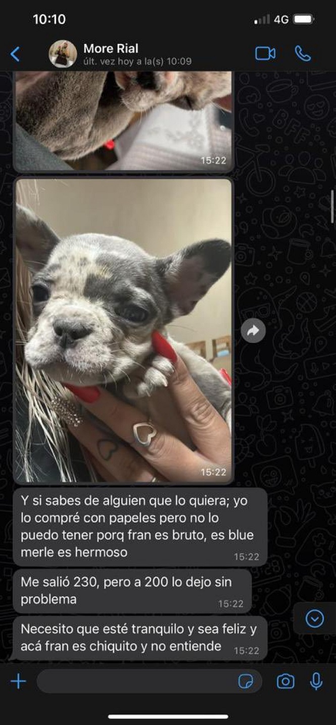 En la conversación, la hija de Jorge Rial ofrece a su mascota de raza por 200 mil pesos. “Y si sabés de alguien que lo quiera. Yo lo compré con papeles pero no lo puedo tener porque Fran es bruto, es blue merle, es hermoso. Me salió 230, pero a 200 lo dejo sin problema. Necesito que esté tranquilo y sea feliz, y acá Fran es chiquito y no entiende”, expresó.