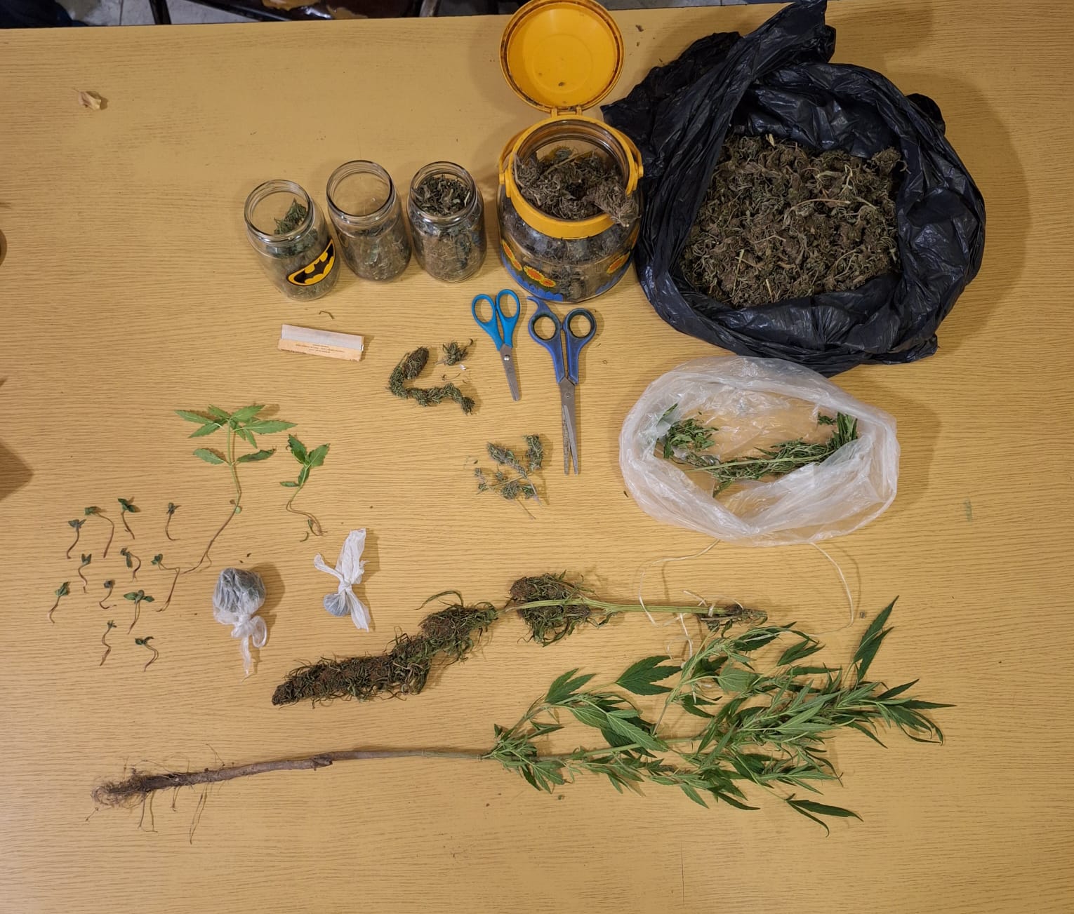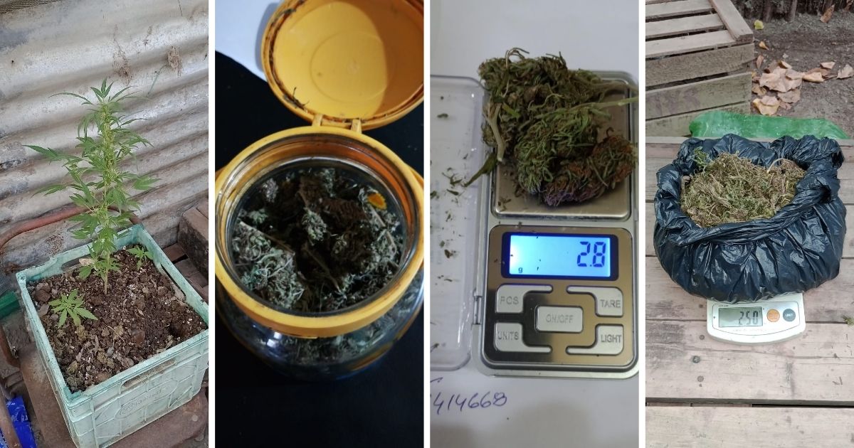 Entre lo incautado se encuentran varias bolsas, frascos y envoltorios con cogollos de marihuana, totalizando más de 400 gramos. Además, había una planta natural de 72 centímetros, varios plantines de diferentes tamaños, una rama en proceso de secado, tijeras con restos de cannabis y un librillo de papel engomado.