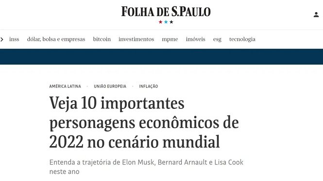 El diario Folha de San Pablo realizó el listado con las diez personalidades más destacadas de las finanzas a nivel mundial durante este 2022. El ministro de Economía, Sergio Massa, fue uno de los destacados por el reconocido periódico junto a Elon Musk, Christine Lagarde y Jerome Powell.