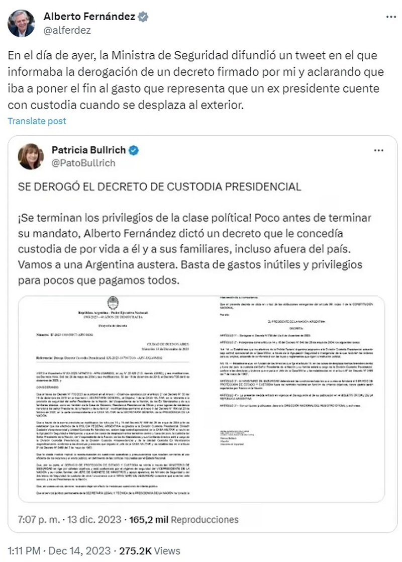 “En el día de ayer, la Ministra de Seguridad (Patricia Bullrich) difundió un tweet en el que informaba la derogación de un decreto firmado por mí y aclarando que iba a poner el fin al gasto que representa que un ex presidente cuente con custodia cuando se desplaza al exterior”, indicó en el inicio de su mensaje en “X”, ex Twitter.