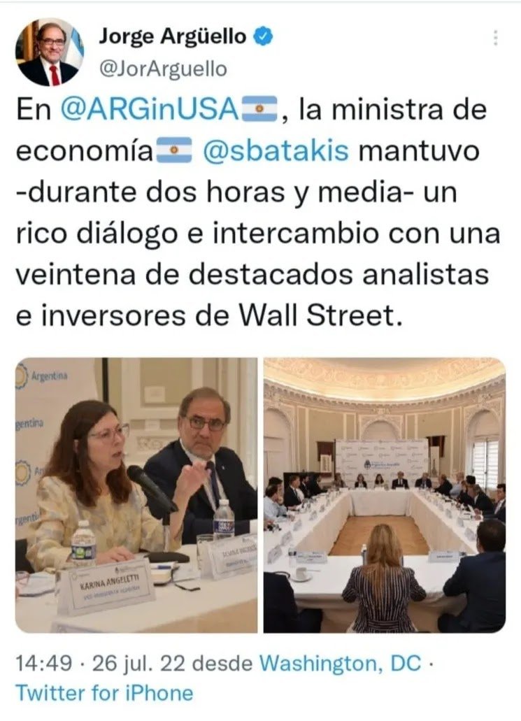 Luego, en su cuenta de Twitter, Argüello destacó que Batakis “mantuvo -durante dos horas y media- un rico diálogo e intercambio con una veintena de destacados analistas e inversores de Wall Street”.