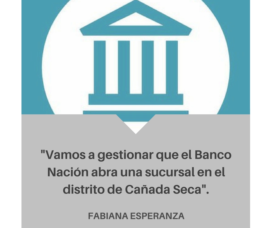 La Concejal Fabiana Esperanza ha solicitado al Banco de la Nación Argentina por medio de un proyecto de Declaración, que contemple la posibilidad de abrir una sucursal de dicha entidad en el distrito de Cañada Seca, con cabecera en Salto de Las Rosas.