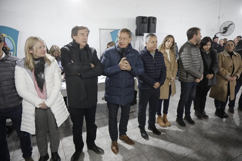 El acto se realizó en el Club Social Deportivo y Cultural General San Martín, debido a las condiciones climáticas, y se sumaron la presidenta del IPV (Instituto Provincial de la Vivienda), María Marta Ontanilla; el senador nacional Alfredo Cornejo; el diputado nacional Lisandro Nieri; los ministros, de Planificación e Infraestructura Pública, Mario Isgro, y de Gobierno, Trabajo y Justicia, Victor Ibañez Rosaz, legisladores y autoridades municipales y provinciales.