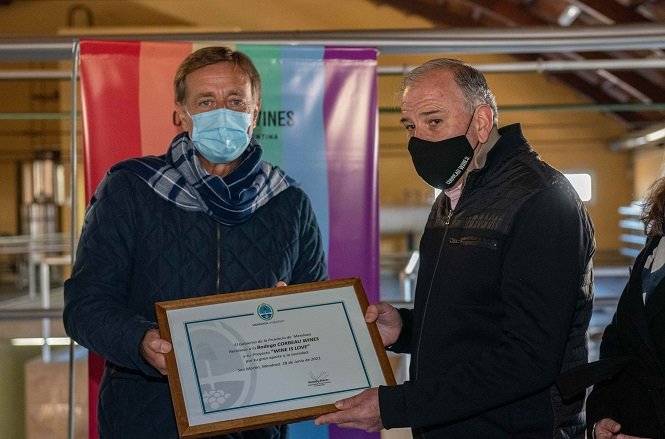 Durante el evento, el Gobernador Suarez junto a la ministra de Cultura y Turismo, Mariana Juri entregó un reconocimiento a la Bodega Corbeau Wines en el marco de las celebraciones previstas en conmemoración del Día Internacional del Día del Orgullo LGBTIQ+, debido a que la Legislatura provincial declaró de Interés Turístico al evento de lanzamiento del Proyecto “Wine is love”.