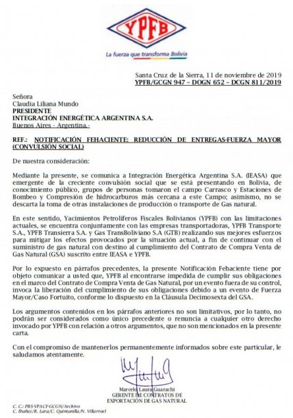 La compañía Yacimientos Petrolíferos Fiscales de Bolivia (YPFB) envió una carta a la empresa Integración Energética Argentina S.A. (IEASA) donde indica que como consecuencia “de la creciente convulsión social que se está presentando en Bolivia”, la empresa está “impedida de cumplir sus obligaciones” respecto de la provisión de gas rumbo a Argentina.