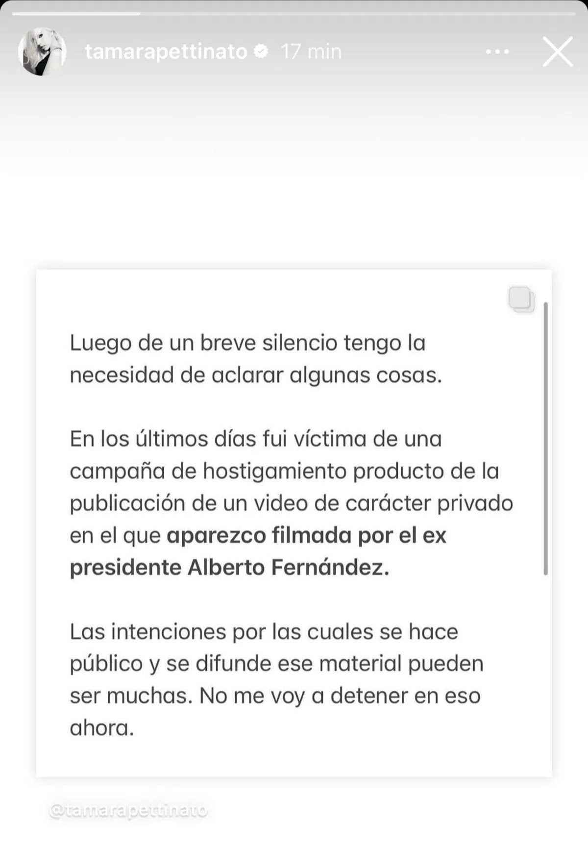 “Luego de un breve silencio tengo la necesidad de aclarar algunas cosas. En los últimos días fui victimario de una campaña de hostigamiento producto de la publicación de un video de carácter privado en el que aparezco filmada por el ex presidente Alberto Fernández”, comenzó escribiendo.