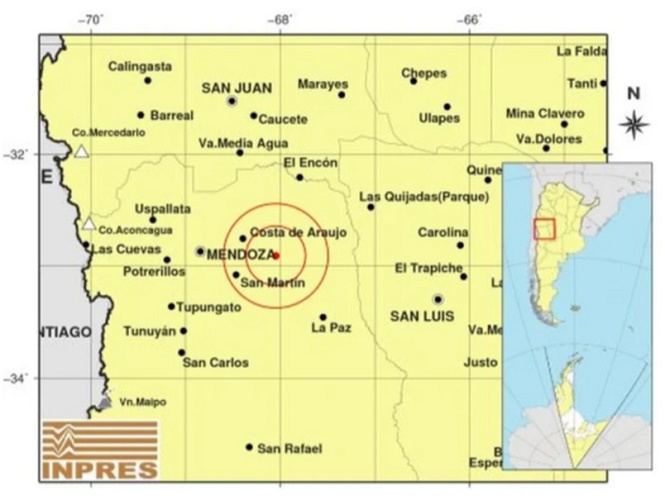 El primero de ellos ocurrió a la 01:31, con epicentro ubicado a 74 km al Este de Mendoza y a 37 km al Sureste de Costa de Araujo. Según el Instituto Nacional de Prevención Sísmica (Inpres), tuvo una magnitud de 2.7 en la escala de Richter y una profundidad de 152 km.