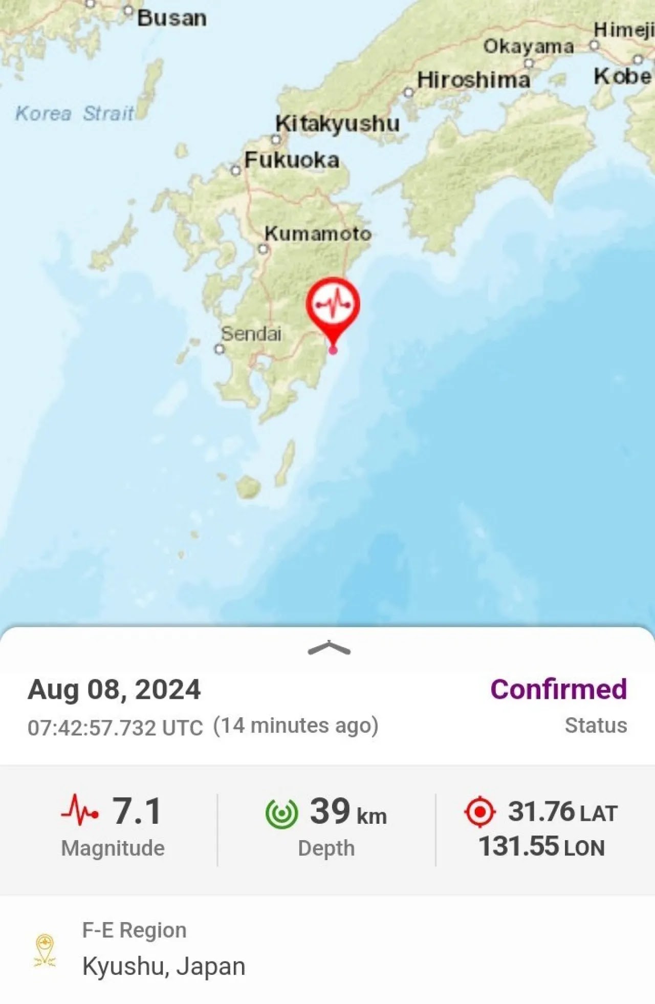 Este jueves se produjo un terremoto de magnitud 7,1 en la zona sudoeste de Japón. Este hecho obligó a la Agencia Meteorológica local (JMA) a que active una alerta de tsunami de hasta un metro de altura en la zona costera del Pacífico.