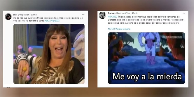 “Thiago acaba de contar que sabía todo sobre la venganza de Daniela, que ella le contó todo lo de afuera y sobre la movida ‘Venganiela’. Parece que solo a Juliana se la puede sacar por contar cosas de afuera”, señaló otro usuario indignado.