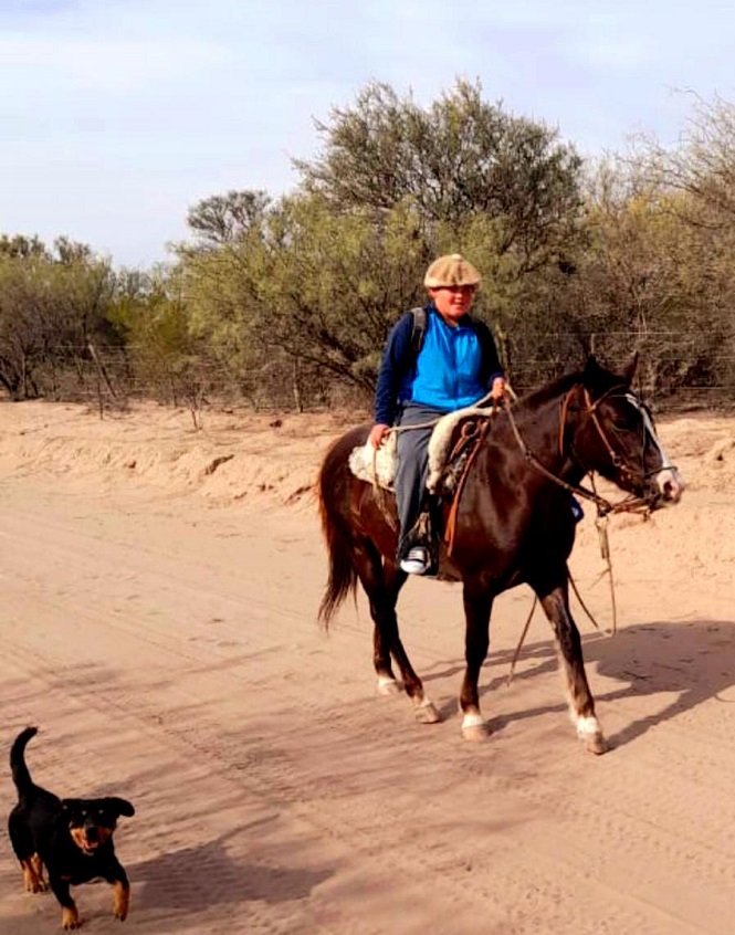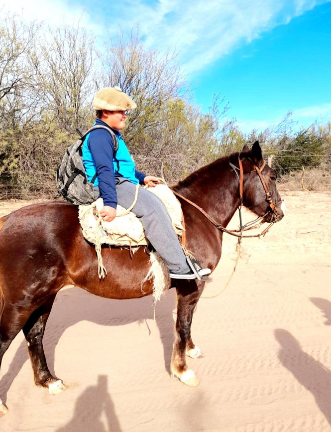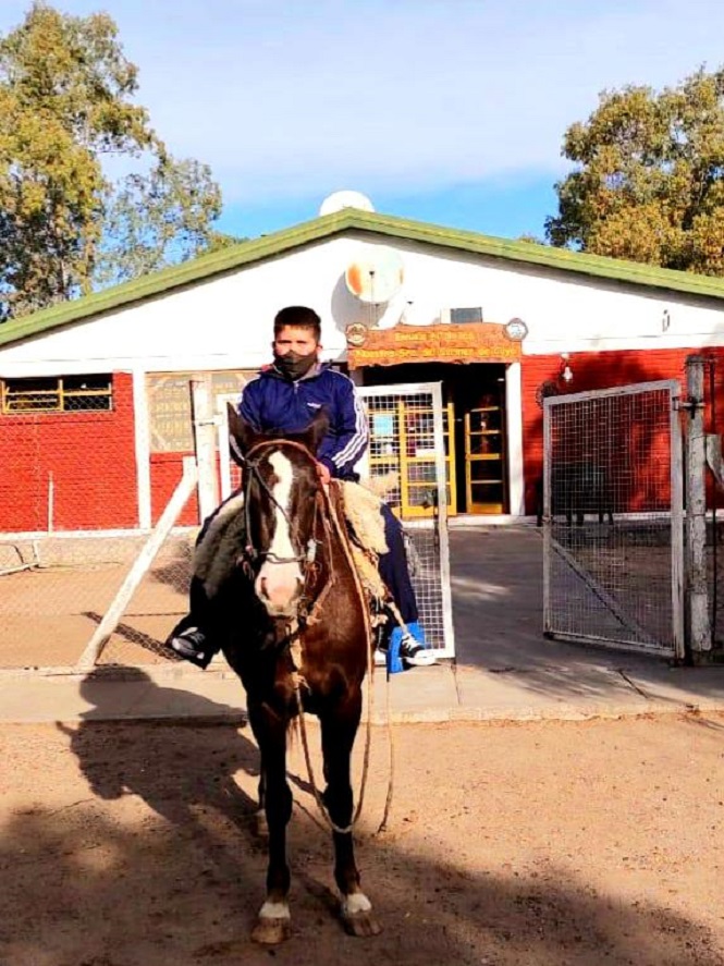 Montado a su fiel amiga “Carnavalera”, su compañera de cuatro patas, recorre senderos y huellas para poder estudiar. Son diez kilómetros que lo separan desde su casa ubicada en el puesto El Zanjón de la Estancia Don Doménico hasta llegar a su amada escuela, donde todos conocen su historia y es recibido por sus amigos y docentes.