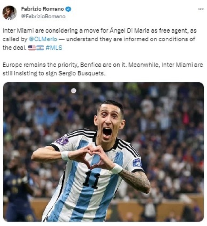 “Inter de Miami estudia fichar a Ángel Di María como agente libre, según ha adelantado @CLMerlo – entienden que están informados de las condiciones del acuerdo. #MLS”, publicó en su cuenta de Twitter.