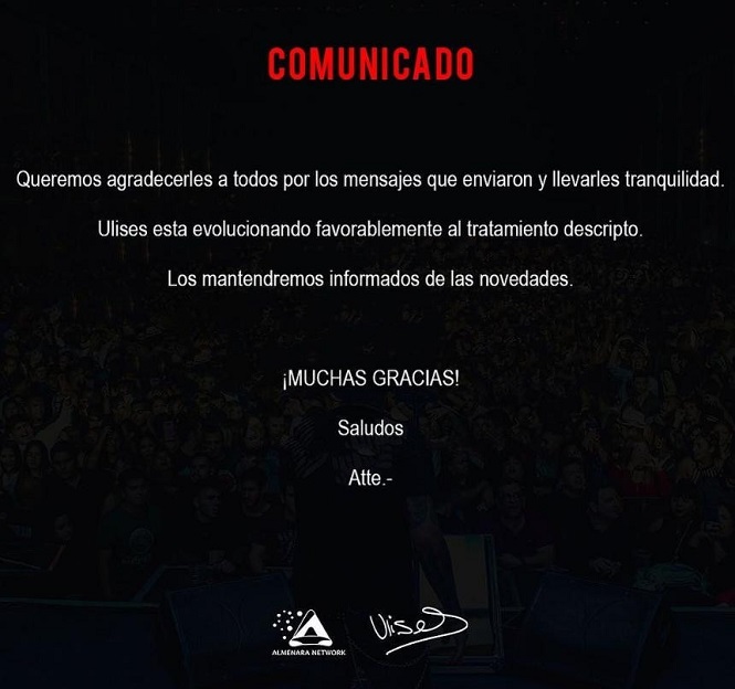 Los familiares decidieron llevarle tranquilidad a sus fanáticos e informaron que “Ulises está evolucionando favorablemente al tratamiento descripto”. Sin embargo, explicaron que “está asistido con oxígeno”.