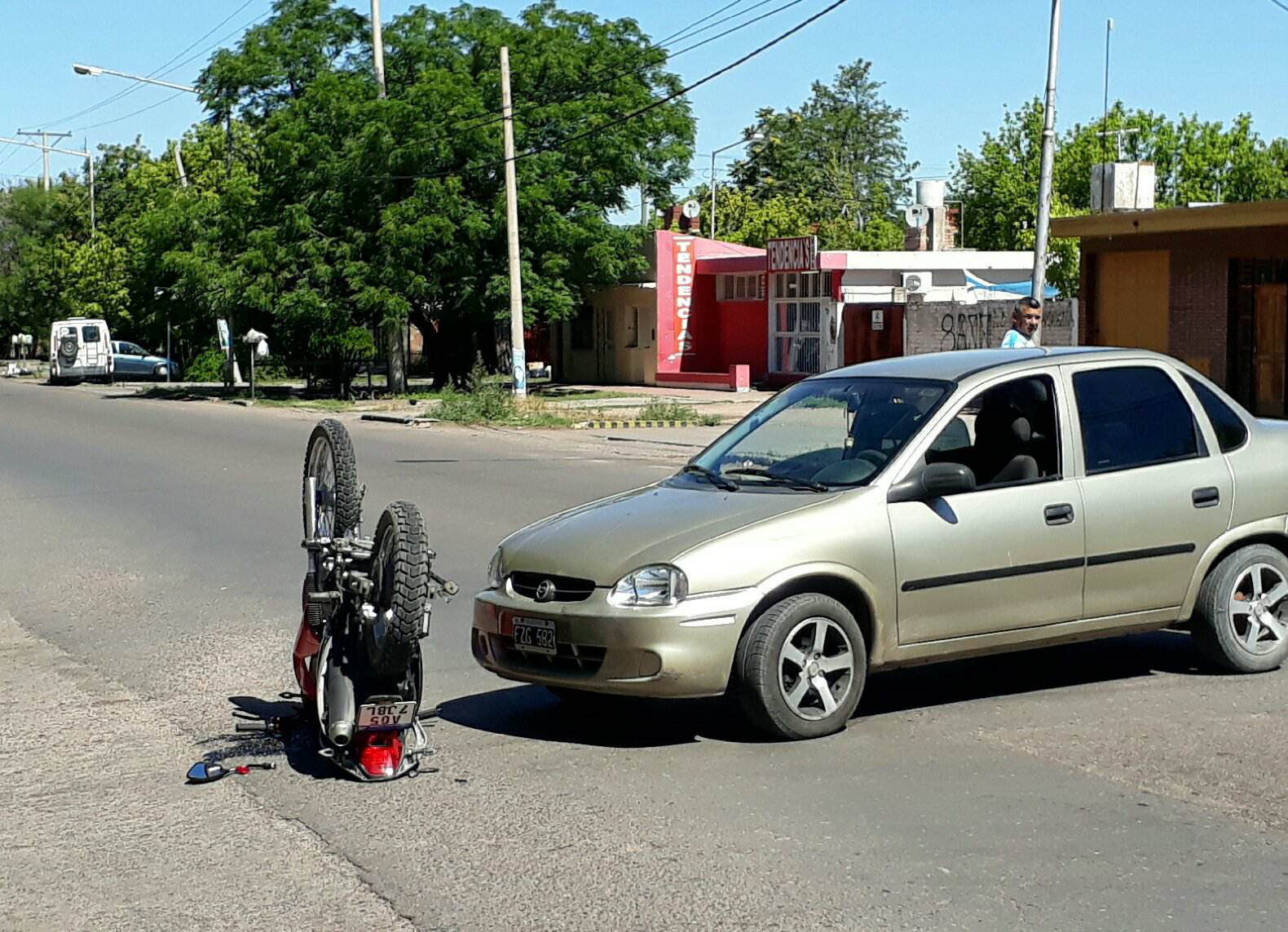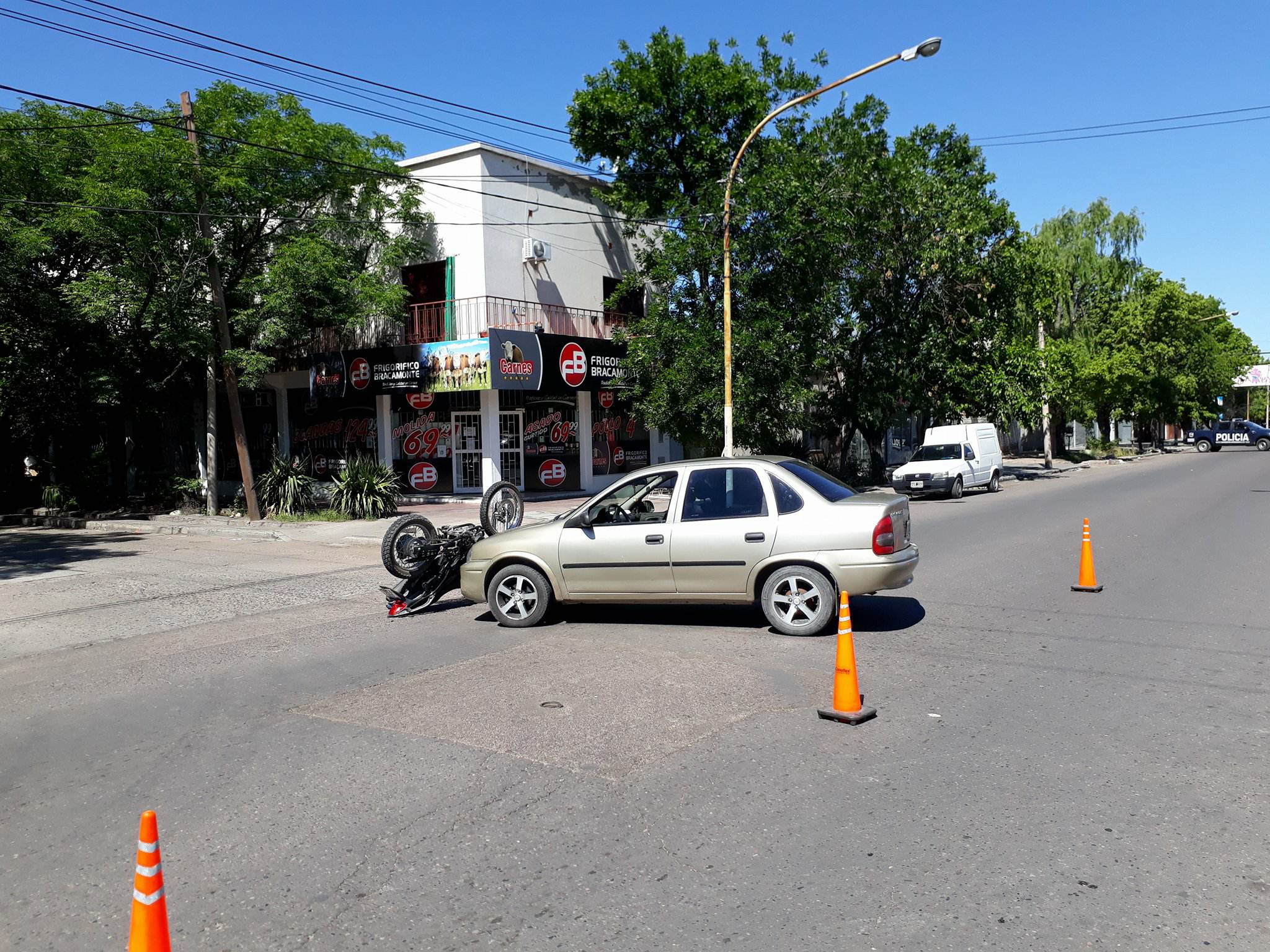 Hace instantes en avenida Alberdi y calle San Lorenzo se produjo un siniestro vial protagonizado por un automóvil Corsa Classic y una moto 150cc.