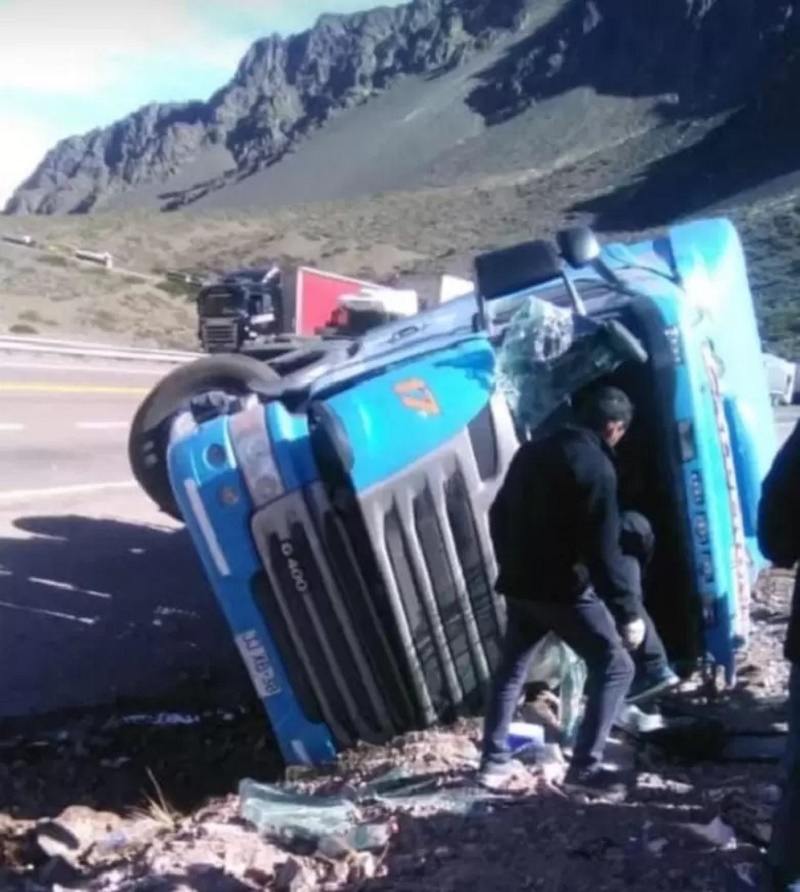 Un espectacular accidente ocurrió cerca del mediodía en la alta montaña mendocina. Es que en la ruta 7, a la altura del km 1.190, en Polvaredas, un camión de origen chileno chocó contra un cerro y volcó sobre la orilla del camino.
