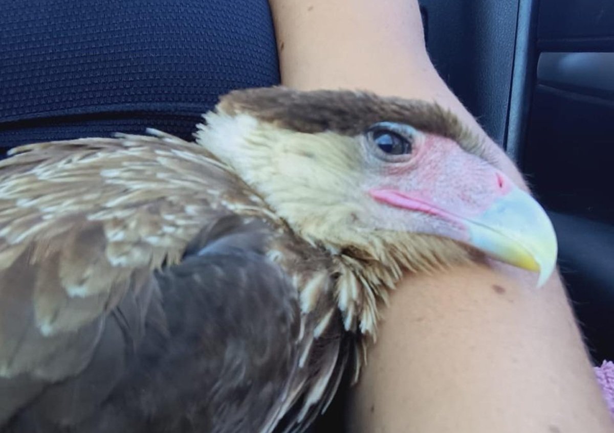 Daniel y Carolina Amormino se dieron cuenta de que el ave no se movía y decidieron parar para ayudarlo. “Estaba como sentado, en una posición atípica para un carancho”, cuenta Daniel. “Nos acercamos por la espalda y no se movía. Lo tomé entre mis brazos y el animal se dejó agarrar. Lo llevé debajo de un árbol, intentamos darle agua y en la desesperación fuimos a buscar un veterinario a Monte Comán”.