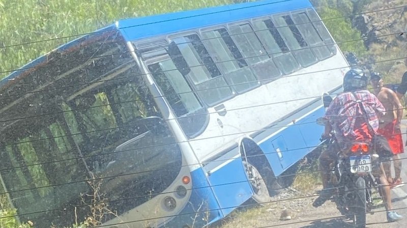 El incidente ocurrió en la curva del Radio Club, entre el predio de la Virgen y el camping, cuando el chofer del colectivo debió abrirse para esquivar al automóvil. Como consecuencia, la unidad quedó inclinada peligrosamente al borde del barranco.