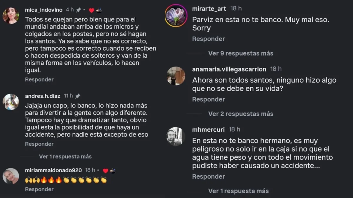 Algunos seguidores le advirtieron que la maniobra podría ser sancionada por la policía local y que, más allá de la diversión, poner en riesgo la seguridad propia y la de otros no es un juego.