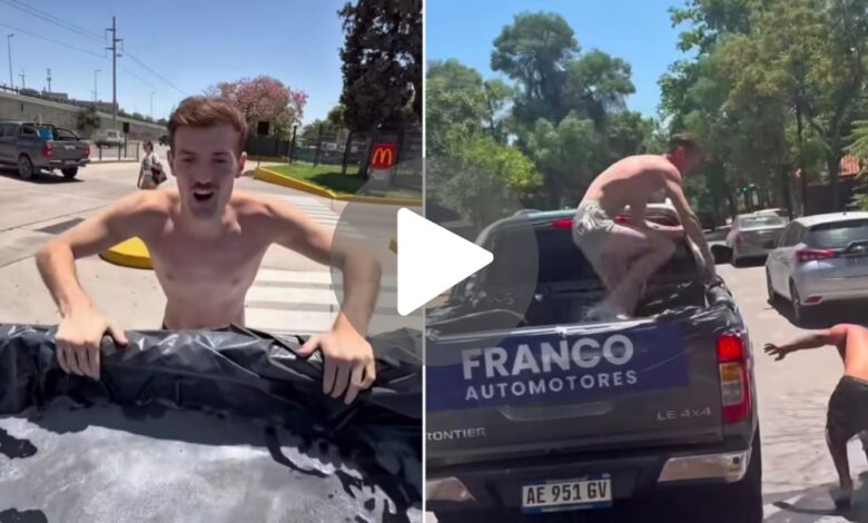 Un influencer ruso improvisó una pileta en la caja de una camioneta y recorrió las calles de Mendoza