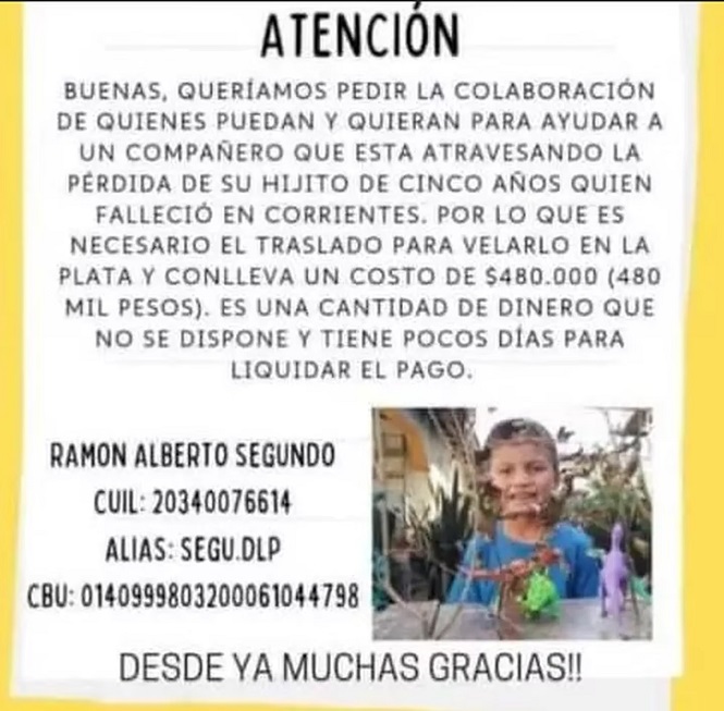 La tragedia golpeó a la familia cuando el pequeño Noah se encontraba pasando unos días de descanso con su mamá en Corrientes, de visita en la casa de unos familiares. Ahora, en medio de la conmoción por la noticia de su muerte, su papá, Ramón Segundo, pide ayuda para traer el cuerpo de su hijo a La Plata, donde vivían, para darle el último adiós.