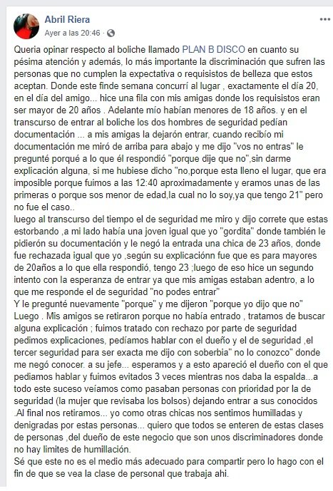 Una joven de nombre Abril Riera (20) publicó en Facebook haber sufrido un hecho de discriminación por parte del personal de seguridad y del dueño del boliche Plan B Disco en la noche del Día del Amigo. La razón habría sido –según ella manifiesta– por su contextura física. Además, asegura que estaban ingresando menores de edad. Acopañamos la nota de un video filmado por la supuesta damnificada.
